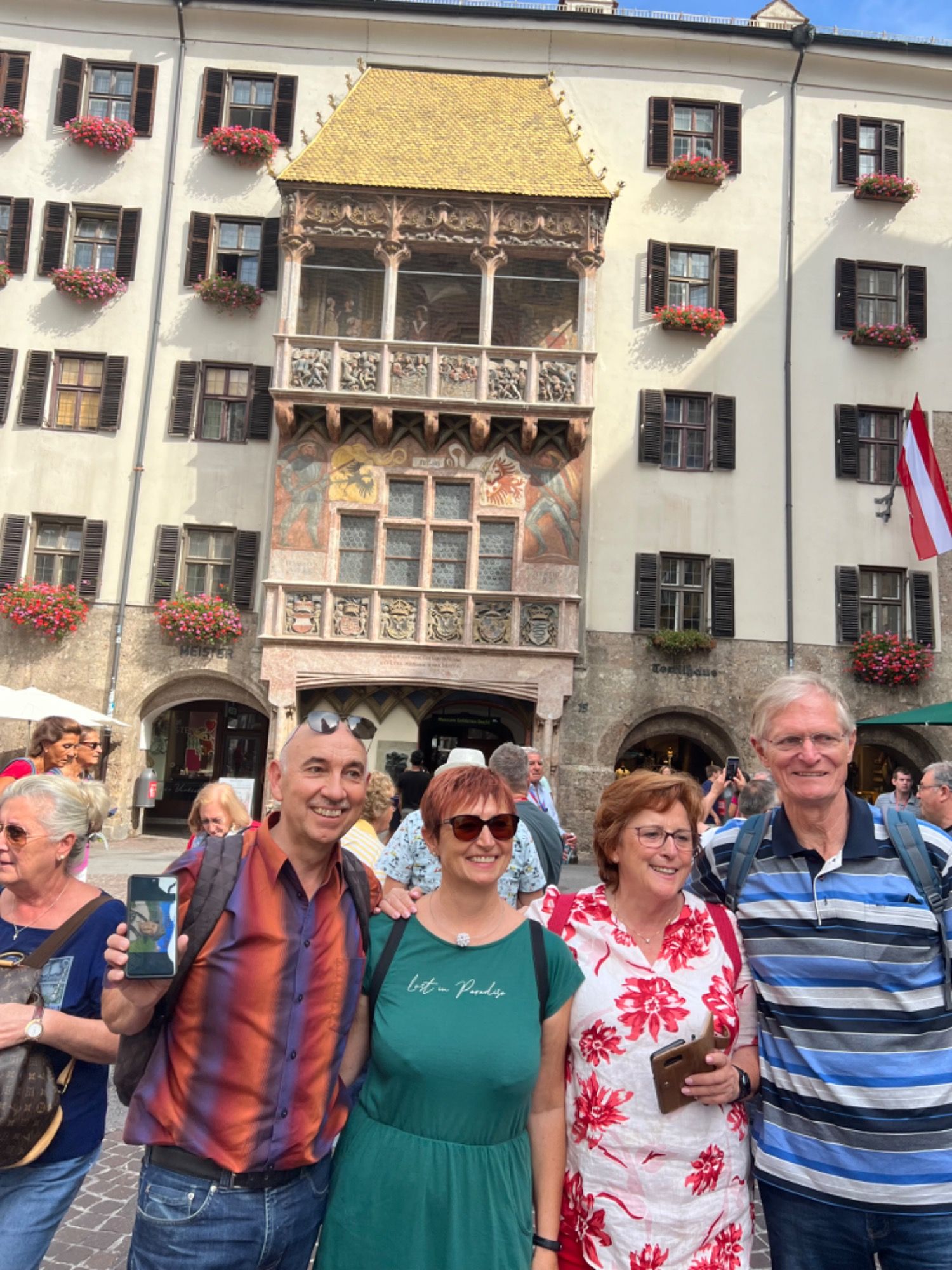 Um 11:00 Uhr sind wir am Goldenen Dacherl in Innsbruck gestartet. Nach ein paar Metern merkten wir, dass unser Gepäck doch ganz schön auf die Schultern drückt. Sicher alles eine Frage der Zeit, dann hat man sich daran gewöhnt….