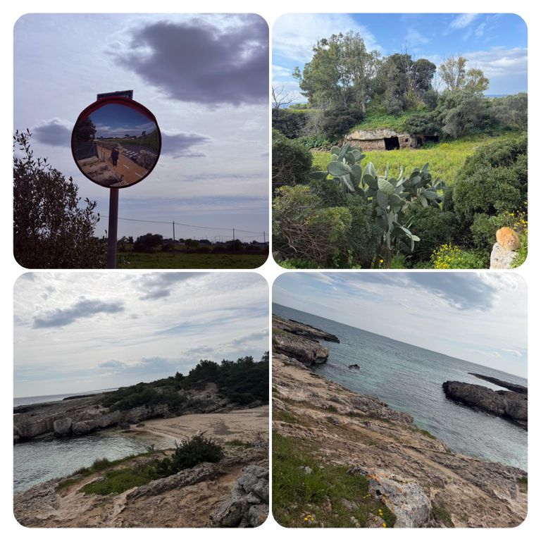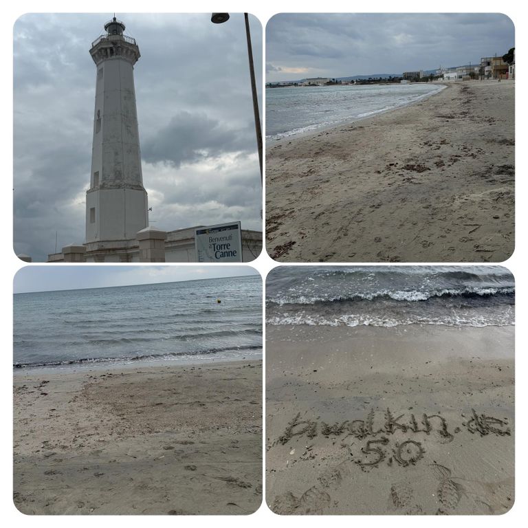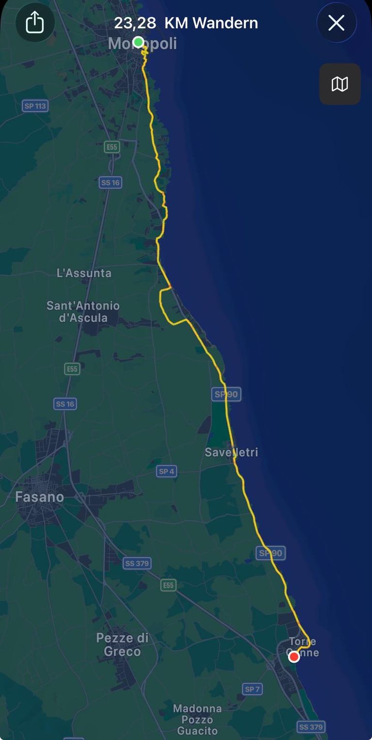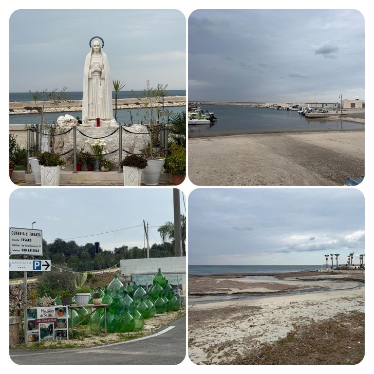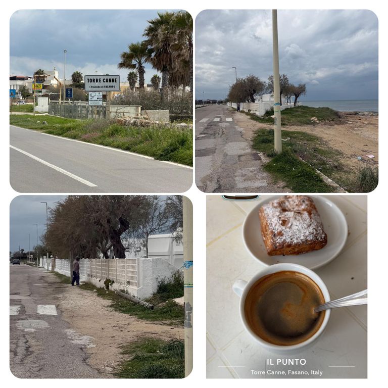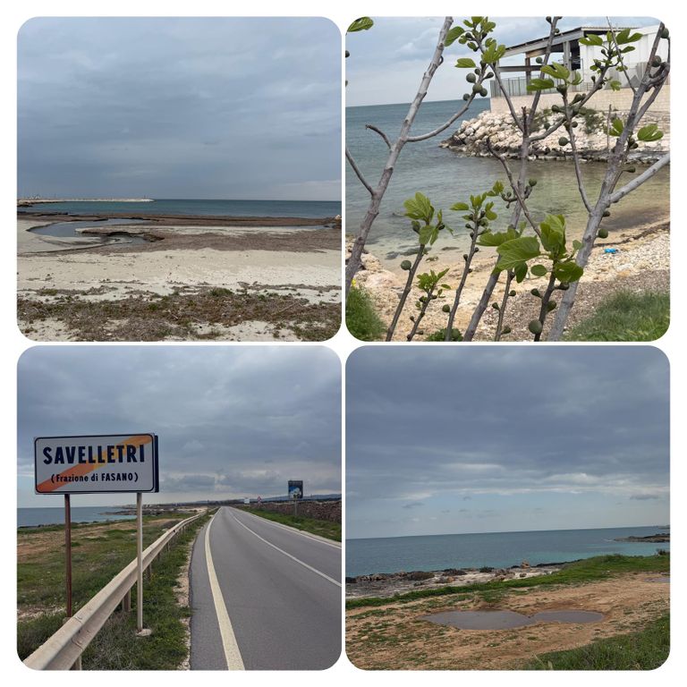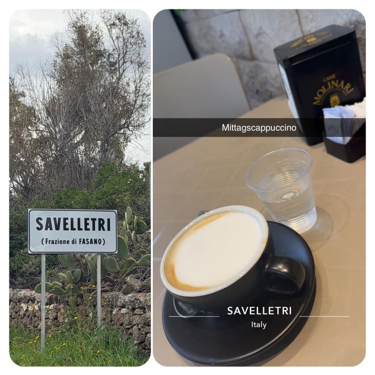 Der Weg führte mich nun an der Straße lang, was aber kein Problem war, da kaum Autos unterwegs waren und ich lange mit iIna telefoniert habe. In Savelletri habe ich dann in einer Bar erneut Pause gemacht, nicht zuletzt um die Toilette zu benutzen, der Busch erscheint mir so alleine keine gute Alternative und so gönnte ich mir einen Café Americano und ein Cornetto mit Schokofüllung.