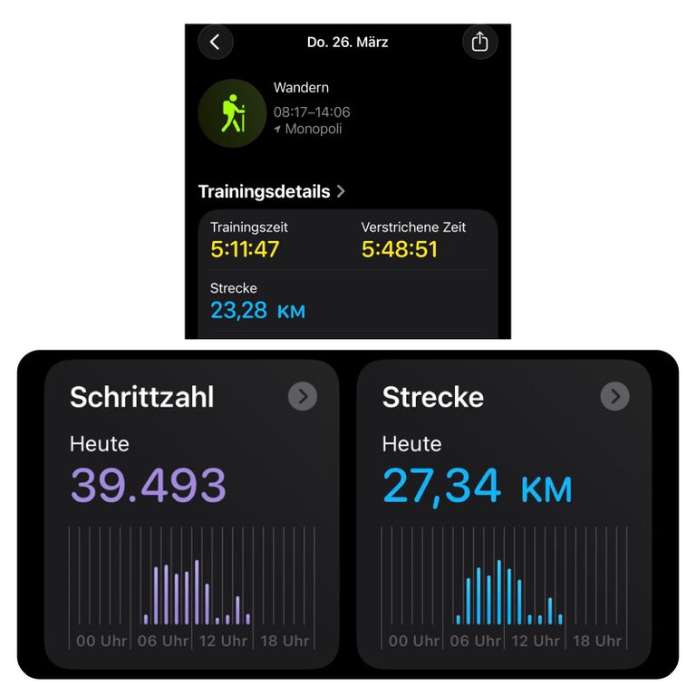 Gewandert bin ich heute 23,28 Kilometer und mit Supermarkt Suche 27,34 Kilometer, dafür brauchte ich 39.493 Schritte