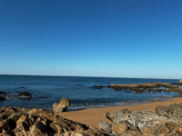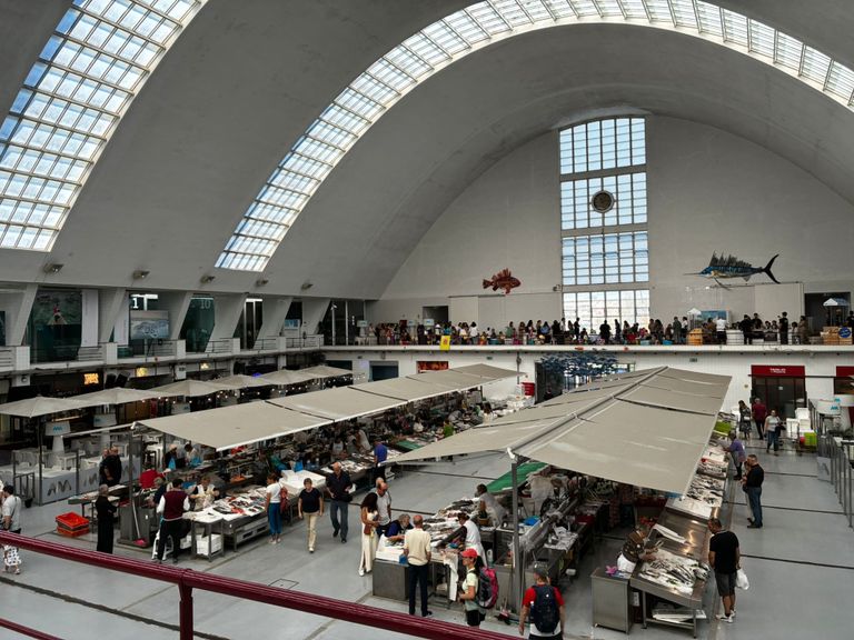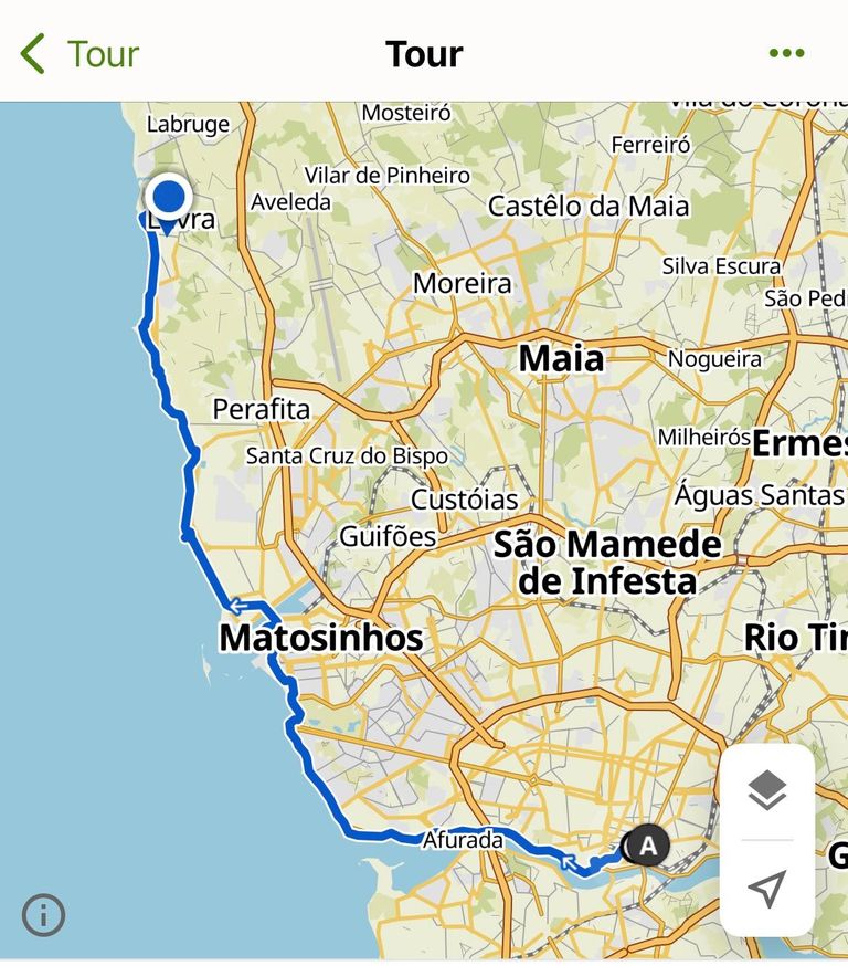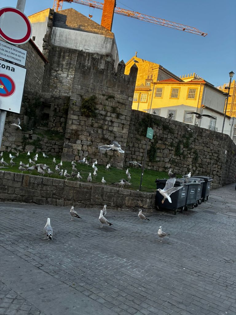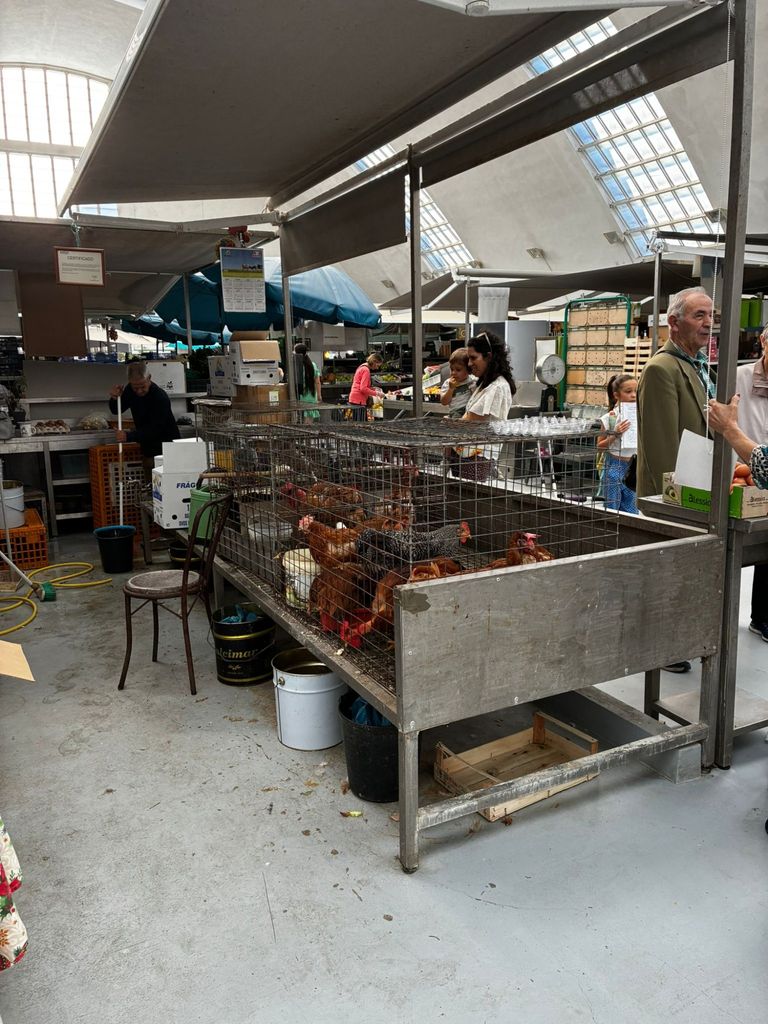 Vor unserer Unterkunft gab es beim Bäcker noch ein kleines Frühstück. An der Kathedrale vorbei ging es dann für uns raus aus Porto Richtung Meer. Nach einer Weile kamen wir an einer Großmarkthalle vorbei, in der es Fisch, Obst und Gemüse zu kaufen gab. Man hätte sich aber auch ein lebendes Huhn oder eine Taube kaufen können. Wir haben uns dann doch eher jeweils für einen Apfel und eine Banane entschieden .