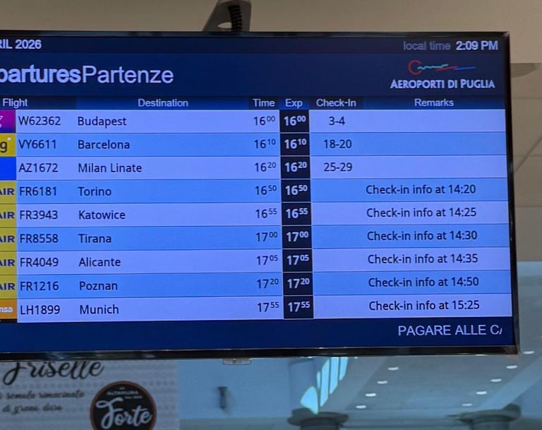 Ich machte mich mit dem Zug vom Hauptbahnhof in Bari auf den Weg zum Flughafen. Hier angekommen wollte ich mich informieren, leider unmöglich. Irgendwann bekam ich dann die Info, dass alles in Ordnung sei, der Flug wäre bestätigt.