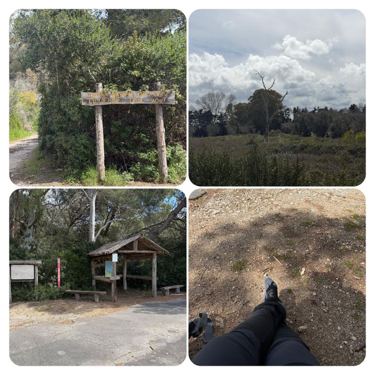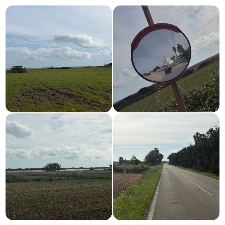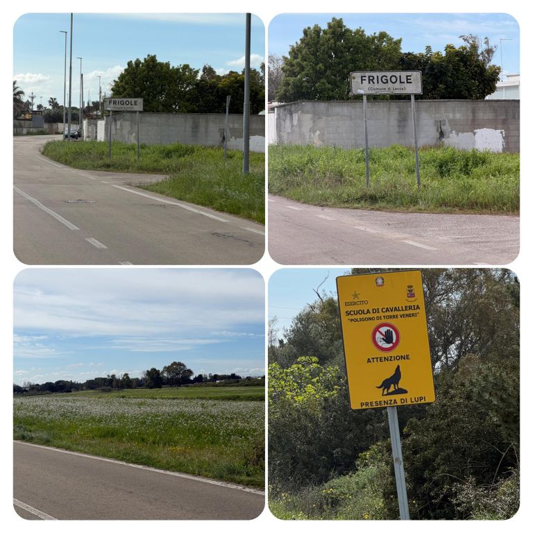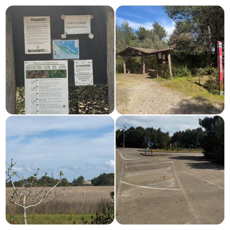 Gegen viertel vor eins kam ich endlich zum erwarteten Naturschutzgebiet Le Cesine, es ist wohl auch ein WWF Schutzgebiet, hier sollte ich gegen eins nach mehr als zwanzig Kilometern endlich eine super Pausenbank finden um mich ein wenig auszuruhen, ich hatte ja noch weitere 15 Kilometer auf der Uhr. Als ich dem Weg durch das Naturschutzgebiet weiter folgte kamen mir tatsächlich zwei joggende Menschen entgegen und ein Läufer kam von hinten. Das war bis dahin auch die einzige lebendige Begegnung. Auf dem Weg waren einige Warnschilder vor Wölfen aufgestellt, ich hoffte auf keine Begegnung. Ist gut gegangen.