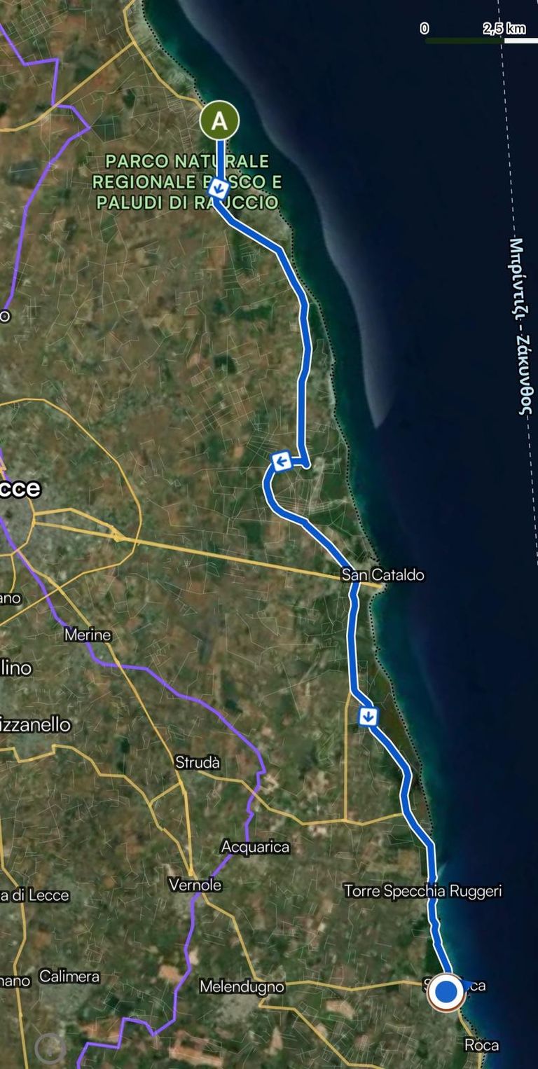 Unsere Wanderung beginnt heute in San Loca und führt uns erneut durch ein Naturschutzgebiet, den Parco Naturale regionale Bosco e Paludi di Rauccio. Wir kommen vorbei am Poligono di Torre Veneri bis wir schließlich in San Cataldo ankommen werden, wo wir die Nacht verbringen.