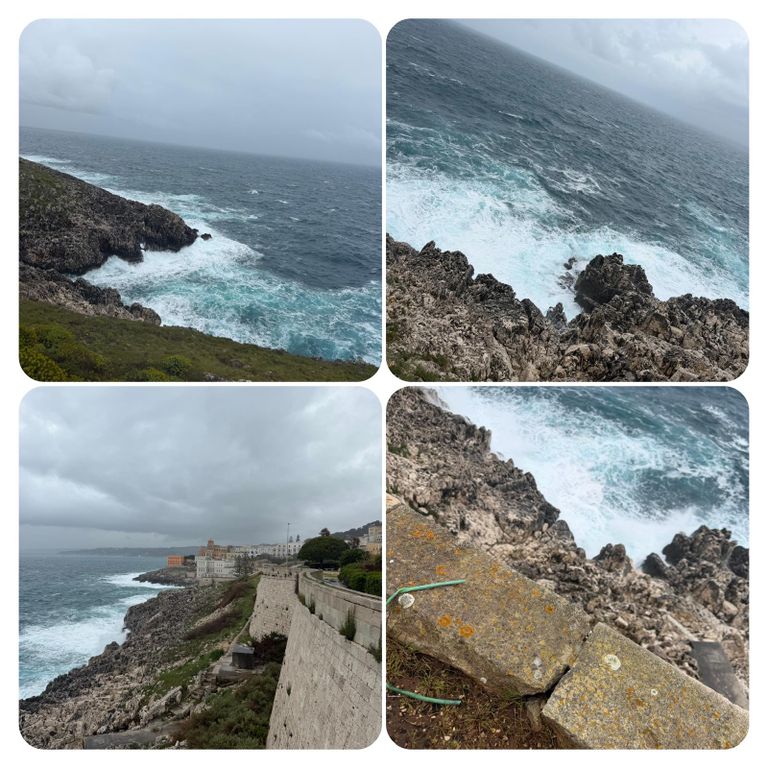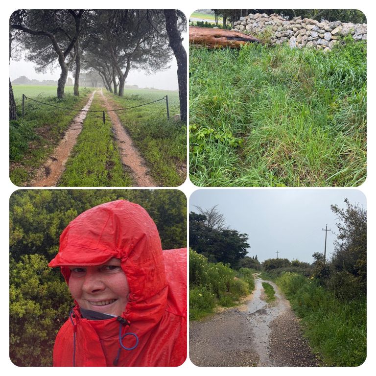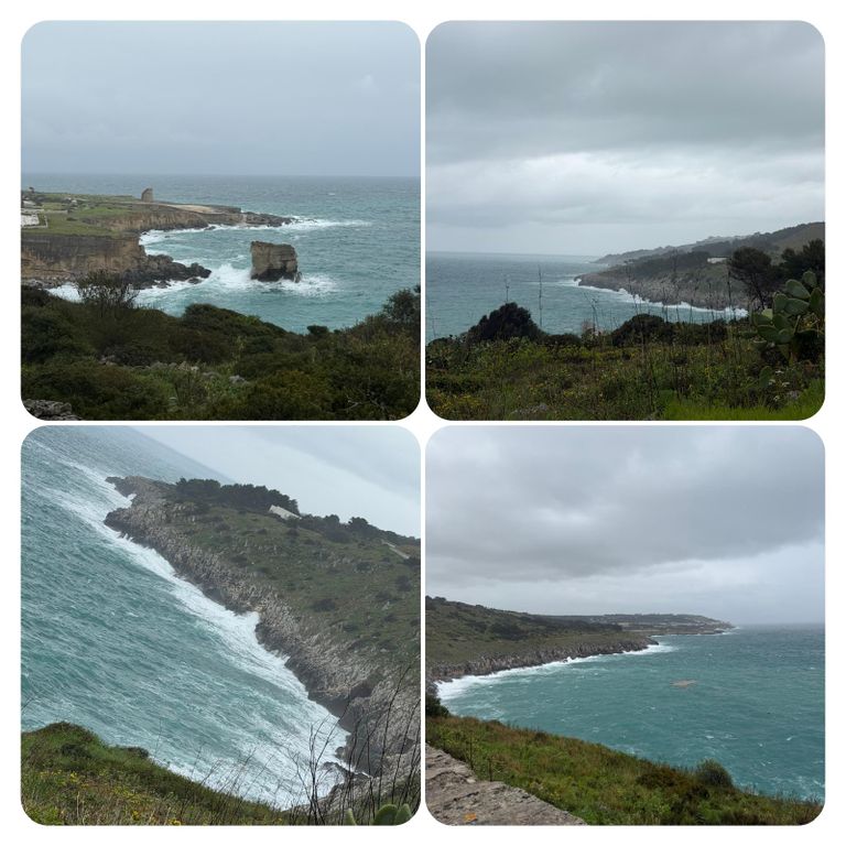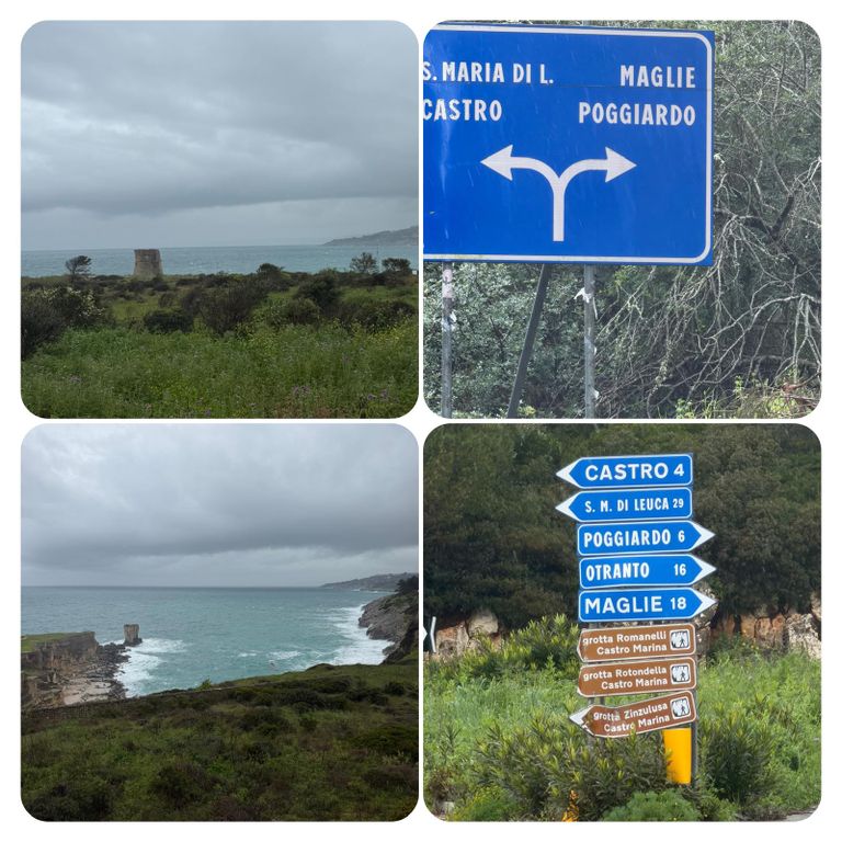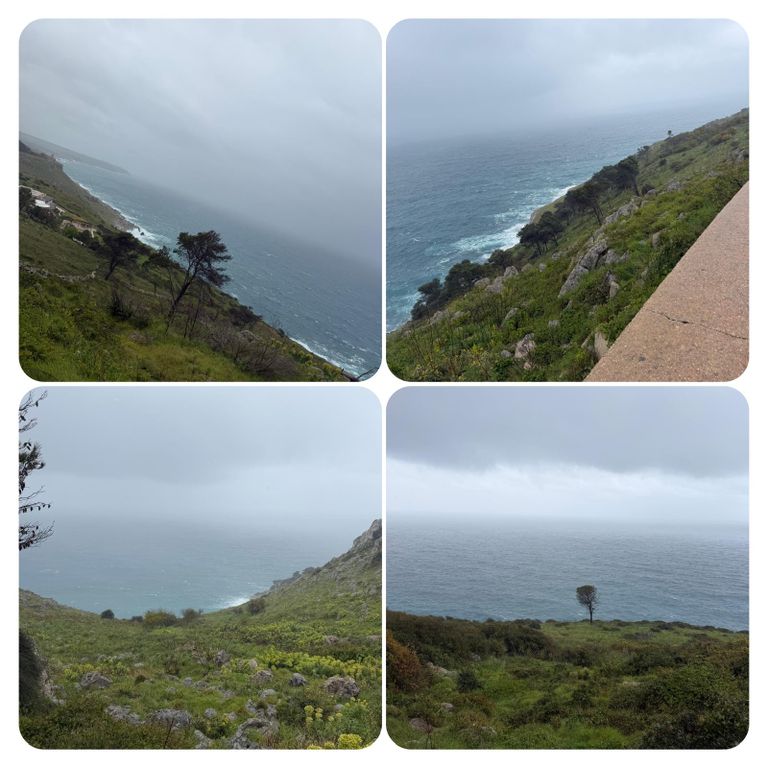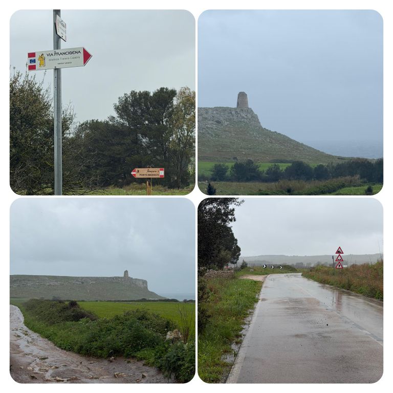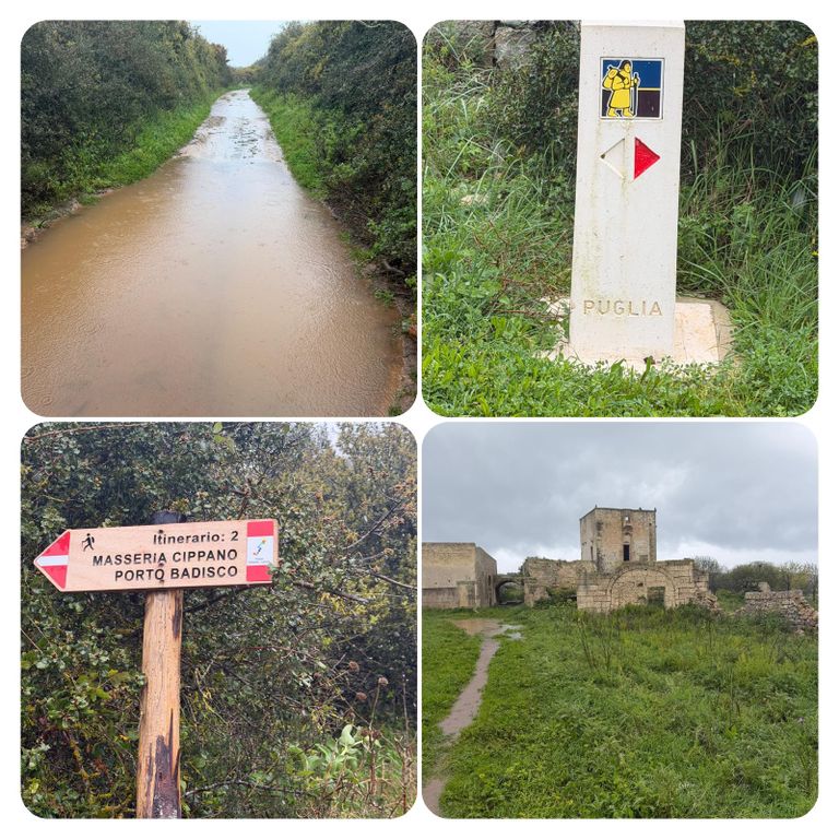 Zuerst führte mich mein Weg an der Straße entlang den Berg hinauf, als ich die Stadt verlassen hatte ging’s weiter auf dem Wanderweg PUGLIA. Hier waren die Wege zeitweise erneut Flüsse, riesige Pfützen oder gleich Seen. Ich versuchte diese irgendwie zu umgehen, doch nach kurzer Zeit war es völlig egal, das Wasser lief von oben in meine Schuhe und der Pegel war dementsprechend schnell höher als der der Loisach. So musste ich nicht mehr auf die tiefen Pfützen achten, da es es keinen Unterschied mehr machte. Jetzt galt es nur noch aufpasse, da es entsprechend matschig und rutschig war. Irgendwann kam ich dann zurück auf die Straße und diese wollte ich auch nicht mehr verlassen, auch wenn mein Navi mich permanent auf diese komischen Wanderwege oder besser Wanderflüsse zurückführen wollte. Die Straße war eine Küstenstraße mit wunderschöner Aussicht. Trotz des Regens ist die Gegend einfach atemberaubend schön .