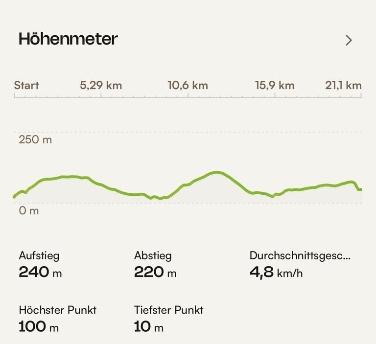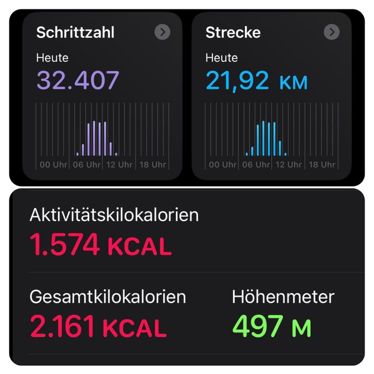 Ich habe heute insgesamt 21,92 km zurückgelegt, davon 240 Höhenmeter bergauf und 220 Höhenmeter bergab. Ich benötigte dafür 32.407 Schritte.