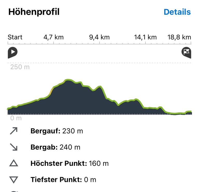 Heute haben wir 18,8 Kilometer zurückgelegt. Währenddessen sind 230 Meter bergauf und 160 Meter bergab gegangen.