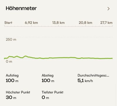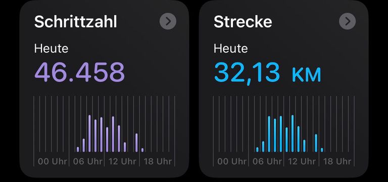 Ich habe heute insgesamt 32,13 km zurückgelegt, davon 100 Höhenmeter bergauf und 100 Höhenmeter bergab. Ich habe dafür 46.458 Schritte benötigt.