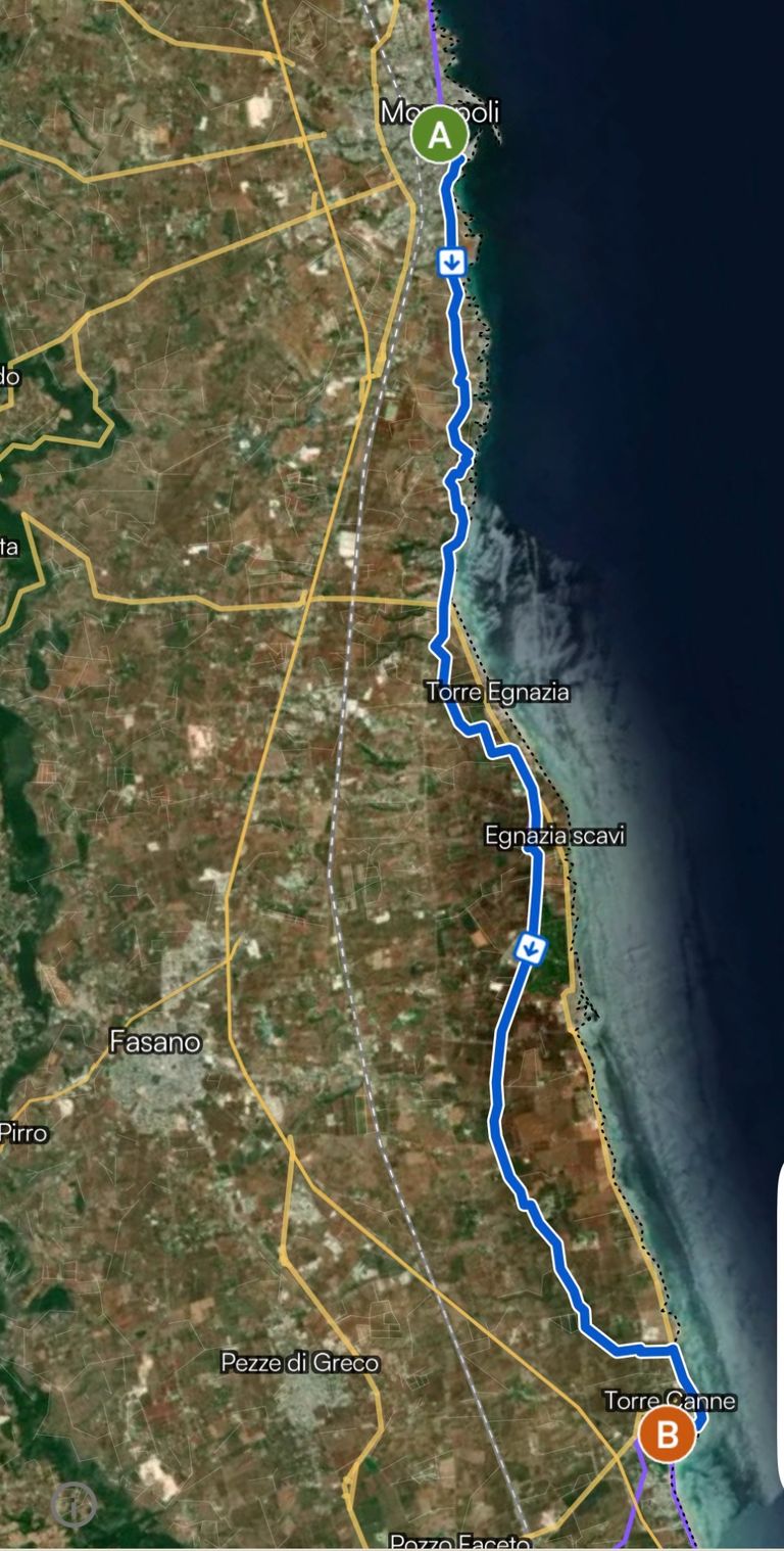 Wir starten unsere Tour in Monopoli, zunächst wandern wir vorbei an Cala Porta Vecchia, wir kommen an der Grotta della Cala Tre Buchi vorbei in Richtung Capitolo. Weiter gehts vorbei an Fasano und Gnathia - den archäologischen Ausgrabungen von Egnatia. Als nächstes liegt Savelletri auf unserer Strecke bevor wir schließlich Tore Canne erreichen werden.