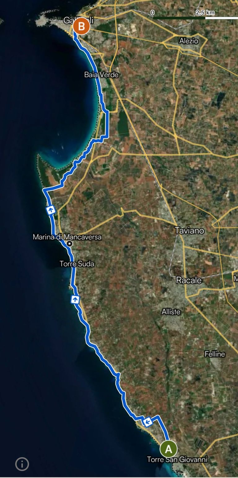 Heute am Ostersonntag startet der Tag in Torre San Giovanni. Wir wandern auch weiterhin am Meer entlang und kommen dabei durch Torre Suda und durch Marina di Mancaversa vorbei an Campo Volo Gallipoli bis wir schließlich Gallipoli erreichen.