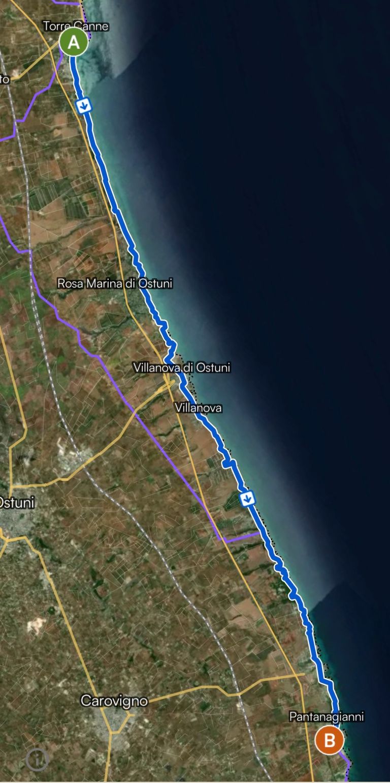Wir kommen vorbei an Ostuni bis wir Vilanova erreichen, von dort geht es weiter zu unserem heutigen Ziel Pantnagianni, dort ankommen werden wir hoffentlich eine Unterkunft für die Nacht finden.