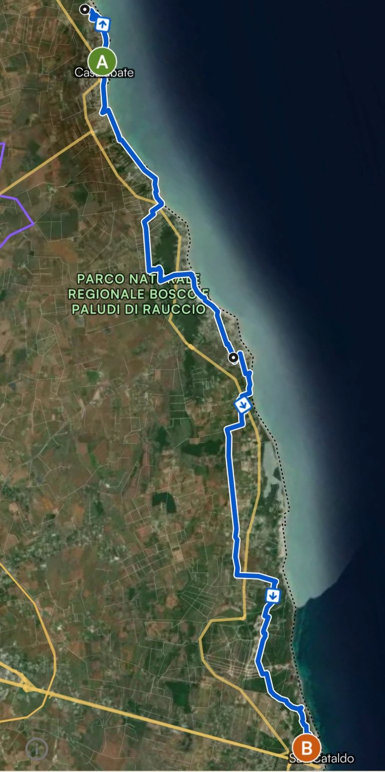 Unsere Wanderung beginnt heute in Casalabate und führt uns erneut durch ein Naturschutzgebiet, den Parco Naturale regionale Bosco e Paludi di Rauccio. Wir kommen vorbei am Poligono di Torre Veneri bis wir schließlich in San Cataldo ankommen werden, wo wir die Nacht verbringen.