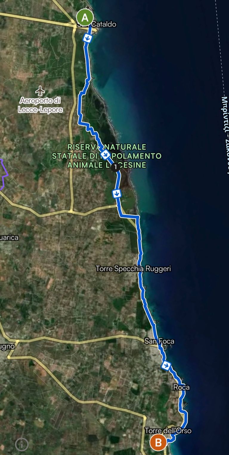 Heute starten wir in San Cataldo und wandern erneut durch Naturschutzgebiete. Zuerst laufen wir durch das Riserva Naturale Setale Biogenetic San Cataldo danach durchqueren wir das Riserva Naturale Statale die Popolamento Animale Le Cesine. Anschließend kommen wir durch Torre Specchia Ruggeri und San Foca bevor wir unser heutiges Ziel Torre dell´Orso erreichen.