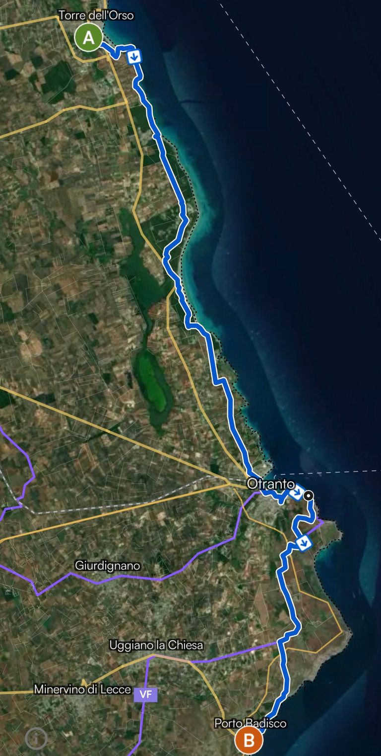Von Torre dell Òrso gehts heute entlang der Faraglioni de' la Castddhruzzastartet bis nach Foce dei Laghi Alimini entlang des Alimini Grande und des Alimini Piccolo nach Porto di Otranto bis nach Porto Badisco.